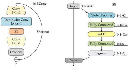 To address these challenges, we propose a lightweight spatial-information-enhanced, fully convolutional neural network for pavement crack segmentation. The network is based on the classic fully convolutional network (FCN) architecture and uses the lightweight EfficientNet-B0 model as the backbone network. EfficientNet-B0 was chosen primarily for its compound scaling strategy, which balances parameter count, computational cost, and accuracy. Furthermore, compared to larger EfficientNet variants, B0 exhibits significantly reduced model complexity, making it more suitable for mobile devices and embedded systems. The core module of EfficientNet is the lightweight MBConv (Mobile Inverted Bottleneck Convolution). MBConv integrates depthwise separable convolutions with the SE (Squeeze-and-Excitation) channel attention mechanism, further enhancing the efficiency and performance of the model. The structure of MBConv is illustrated in Figure 1.