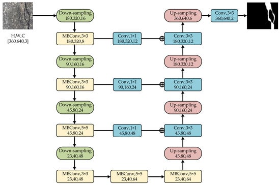 The original EfficientNet architecture is relatively deep, which can lead to over-abstracted target features and the loss of crucial spatial information. To address this limitation, this study reduces the number of down-sampling operations in the backbone network to four, preserving more spatial details. Over-abstraction often results in excessively smoothed segmentation boundaries, hindering the accurate detection of fine crack features—a critical aspect of crack segmentation tasks. Given that crack segmentation involves only two classes—background and target—the informational complexity is relatively low. Therefore, this study also prunes the number of blocks and feature map channels at each down-sampling stage to align the model’s capacity with the simplicity of the input data. The optimized network architecture is illustrated in Figure 2.