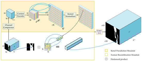 In the feature reorganization module, for each point in the up-sampled output feature map, the corresponding position in the input feature map is located, and a feature sub-map from the neighborhood at that position is extracted. This sub-map is then multiplied with the up-sampling kernel of the corresponding point in the output feature map via a dot product operation. A 1 × 1 convolution is applied to compress the number of channels to dimensions, producing the output . It is important to note that the same up-sampling kernel is shared across different channels at the same position.