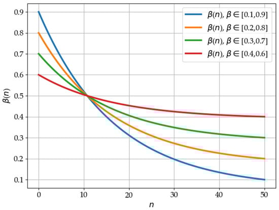 Under the four different preset values of and , the variation trend of the dynamic weight is shown in Figure 5. As the number of training epochs increases, exhibits a nonlinear decay, gradually decreasing from to , with the decay rate gradually slowing down.