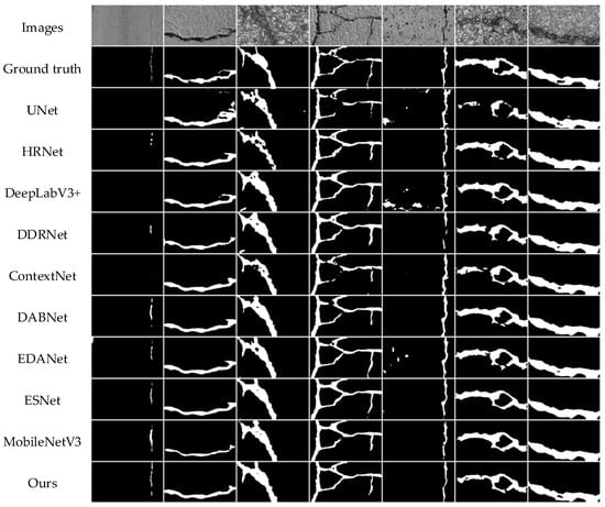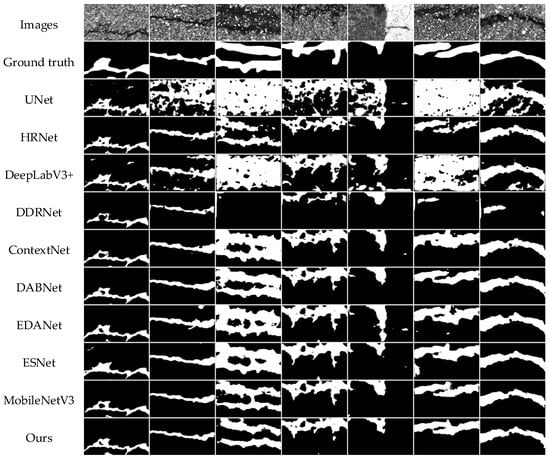 To validate the effectiveness of the proposed model, we compared it with classic semantic segmentation models such as UNet, HRNet, and DeepLabV3+ [18,19,20,21], as well as lightweight models like EDANet and ESNet [37,38,39,40] on the Crack500 test set. Additionally, we compared it with methods from references [8,31,33,41]. The experimental methods were implemented according to Section 4.2, with the cross-entropy loss function used during training. The results of the various models on the evaluation metrics are presented in Table 1. And segmentation results on representative samples are shown in Figure 6.