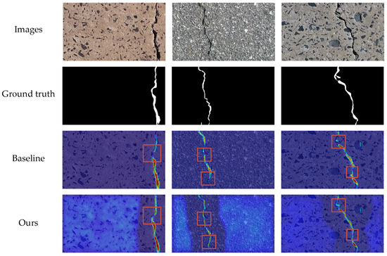 In this study, 1896 images from the Crack500 dataset were used for training, 1124 images for validation, and 348 images for final testing, with all images uniformly cropped to a size of 360 × 640 pixels. To explore the generalization ability of the proposed method across different scenarios and crack types, the model trained on Crack500 was directly applied to all samples in the AsphaltCrack300 dataset. This cross-dataset validation allows for the evaluation of the proposed method’s performance on various crack types and road conditions, providing a better understanding of its applicability in real-world scenarios.