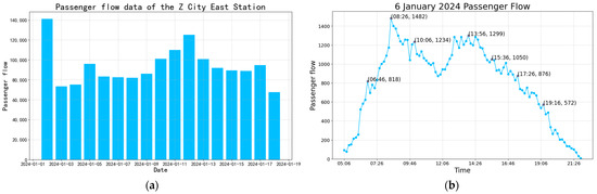The experimental data of this study come from the entry gate data of Z City East Station, a high-speed railway station of critical importance in China’s national railway network. Located in the central region of the country, the Z City East Station is a major transportation hub connecting key north–south and east–west high-speed railway lines. The city it serves is situated in one of the most populous provinces in China, with a provincial population exceeding 99 million (2023 data). The station itself is among the busiest in the region, handling an average daily passenger volume of over 150,000, which can surge to more than 200,000 during peak periods such as holidays. These characteristics make the Z City East Station a typical example of the challenges faced by major high-speed railway stations in densely populated urban areas.