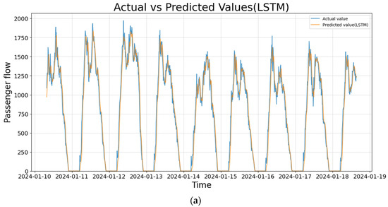 Based on Table 1 and Figure 4, it is evident that the LSTM baseline model exhibits significant advantages in handling time-series data. By capturing long-term dependencies between data points, the LSTM baseline model effectively tracks trends in passenger flow changes but tends to underestimate peak predictions. This may be due to the model’s insufficient capture of non-linear patterns in the data or the network’s inadequate capacity to express such complexities.