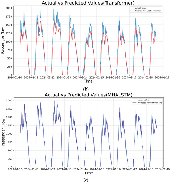Line graph for comparison of passenger flow forecast results. (a) Comparison chart of the LSTM model; (b) comparison chart of the Transformer model; (c) comparison chart of the MHALSTM model.