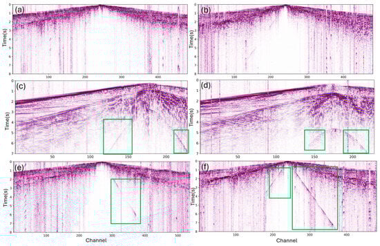 Typical characteristics of airwave noise (indicated in green). (a) No airwave noise; (b) Weak airwave noise; (c,d) represent airwave noise in three-dimensional exploration, where (c) is closer to the seismic source than (d); (e,f) depict typical airwave noise in two-dimensional seismic exploration.