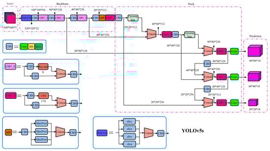 In this study, the model outputs three feature maps, corresponding to grid sizes of 80 × 80 × C, 40 × 40 × C, and 20 × 20 × C, enabling the detection of objects of varying dimensions. Here, C represents the number of channels in the output layer (see Figure 2), calculated as []: