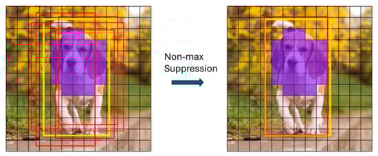 Furthermore, identical or adjacent grid cells may produce multiple overlapping anchor boxes. To address this, this study implements the Non-Maximum Suppression (NMS) algorithm [] to remove redundant anchor boxes from multiple detections, retaining only the boxes that are most likely to contain objects (see Figure 3). The NMS process involves calculating the IoU between the highest-confidence predicted boxes. An IoU threshold is established to dictate the maximum allowable overlap between two boxes, typically set between 0.3 and 0.5. Any boxes with an IoU greater than the specified threshold are suppressed (i.e., removed from the list). For multiple anchor boxes with high IoU values, a weighted average based on confidence is computed to create a new bounding box, which is then preserved as the final predicted box.