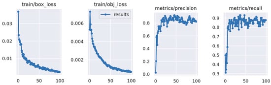 In these equations, the and represent the center coordinates of the bounding box, predicted as offsets from the grid cell centers and then adjusted by the grid’s coordinates. The and represent the width and height of the bounding box, predicted in a log-space (using the exponential function) and scaled by anchor box sizes to ensure that the predicted bounding boxes can handle varying object sizes. The and represents the coordinates of the top-left corner of the grid, while and denote the widths and heights of the prior anchor boxes. The function σ is the sigmoid function, which constrains the offsets to the range (0, 1). The model’s optimal weights are obtained by minimizing the overall loss function, which is a weighted sum of the localization loss and the confidence loss. The model consists of three output layers, with each layer generating a set of bounding box predictions that include the bounding boxes for objects and their corresponding confidence probabilities. When calculating the loss function, the outputs from these three feature maps are considered, and the losses from each layer are computed and accumulated to form the total loss. By conducting loss calculations and optimizations across all three feature maps, YOLOv5m effectively detects objects of varying sizes. This multi-scale loss calculation approach ensures that the model achieves robust detection performance for objects across a range of dimensions.