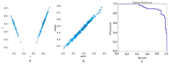 Statistical distribution of samples in the test dataset: (a) A distribution map of predicted locations of airwave noise, where x and y represent the two spatial dimensions of the image, with the top-left corner of the image set as the coordinate origin. (b) Statistical distribution of widths and heights of predicted airwave noise boxes. (c) The relationship between recall and accuracy at different confidence levels.