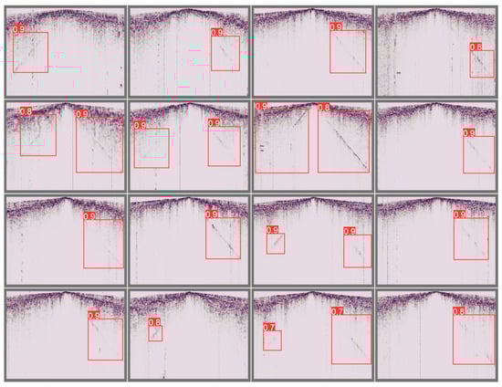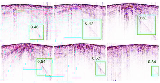 Figure 7 presents several prediction results from the test dataset. Overall, the model effectively identifies prominent airwave noise, with higher-confidence bounding boxes indicating more pronounced interference. The detection of interference locations is also highly accurate. These results confirm the robustness and effectiveness of the YOLOv5 model.