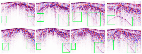 In our dataset, we manually marked the locations of airwave noise in each sample, as illustrated by the green boxes in Figure 1. After screening, we identified a total of 580 samples exhibiting clear airwave noise, with 80% allocated for training and 20% for testing. The training and prediction processes were accelerated using a GPU (NVIDIA GeForce RTX 3070 with 128 GB of memory (NVIDIA Corporation, Santa Clara, CA, USA)). The secondary training comprised a total of 100 iterations, taking approximately 1 h to complete. Upon finishing the training, the prediction time for a single two-dimensional seismic recording was under 0.5 s, while the prediction time for three-dimensional seismic recordings was under 2 s.