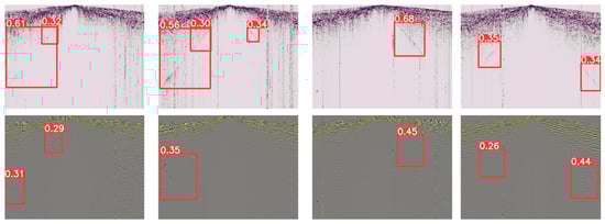 Randomly selected predictions from the test dataset, where the red boxes indicate airwave noise detected by YOLOv5m, and the numbers in the top-left corner represent the confidence levels.
