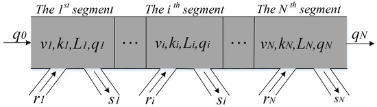 In this section, the state-compensation model is shown, which can be used in the controller in the next step. Therefore, the state-compensation model with discrete space and time is derived based on the above model. The macro density and speed, which can be calculated from the vehicle’s state on the different segments with discrete space and time, can be represented in detail as follows: