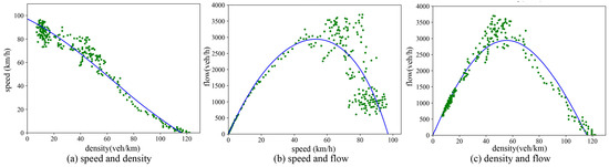 In order to verify the parameters of the traffic flow model, three types of vehicles differed by their dynamics. The parameter settings of vehicles are shown in Table 2. After collecting data on average speed, flow, density, and other metrics for each segment, the data were processed to create a scatter plot. The scatter plot illustrating the average speed, flow, and density was then fitted to demonstrate the relationship among these variables. This is shown in Figure 3, which describes the relationship between speed, flow, and density in a heterogeneous MAS composed of multiple types of CAVs. The points in the figure represent traffic data generated by the simulation platform, while the curve is obtained by fitting these simulation data. It is worth noting that the parameter relationship conforms to the function of the Van Aerde model. The parameters of the heterogeneous are as follows: = 0.0027, = 0.5726, = 0.0, = 97.02 km/h.