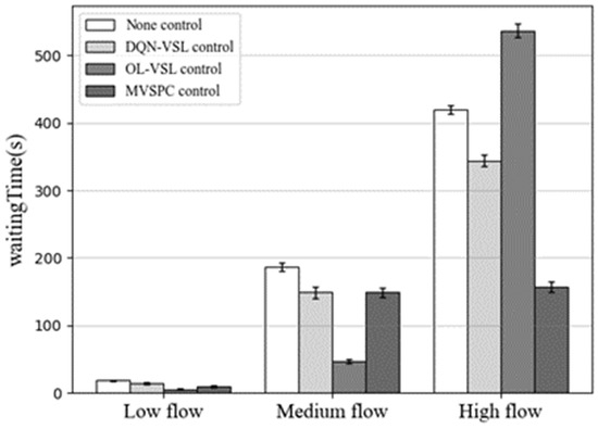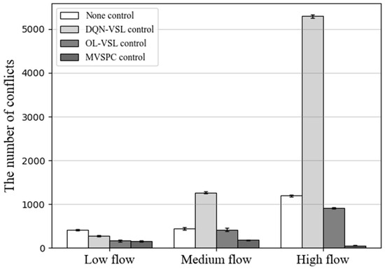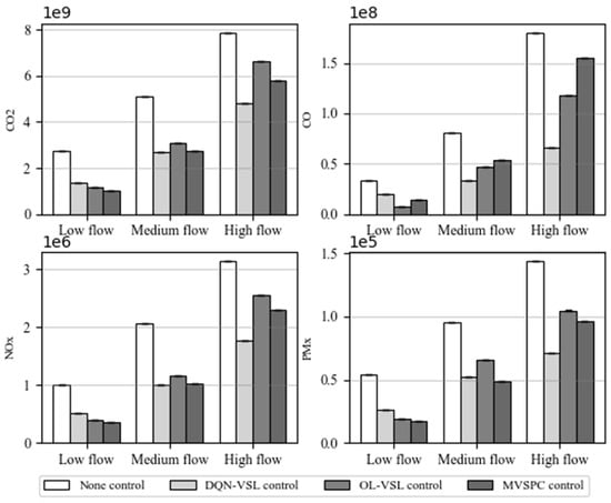 To analyze the simulation results and compare the traffic performances of the different strategies, WT, PC, and average emissions are used to assess efficiency, safety, and environment, as shown in Figure 4, Figure 5 and Figure 6, respectively. More details can be seen in Table 4, Table 5 and Table 6. Compared with the no-control condition, the performance improved by 48.49%, 19.95%, and 62.44% in efficiency and 61.65%, 59.36%, and 95.32% in terms of safety under low-, middle-, and high-traffic demand environments, respectively. These improvements outperform those observed with no control. This is because our control method reduces acceleration and frequently avoids changes in vehicle state, thus decreasing exhaust emissions caused by these acceleration and deceleration behaviors. In terms of emissions, our strategy has achieved improvements of 63.87%, 58.82%, 65.35%, and 68.59% in CO2, CO, NOx, and PMx under low traffic demand; improvements of 46.02%, 34.51%, 50.47%, 49.11%, in CO2, CO, NOx, PMx under medium traffic demand; and improvements of 26.4%, 14.11%, 26.53%, and 32.90%, in CO2, CO, NOx, PMx under high traffic demand. The results show that our integrated control can bring many environmental benefits. Here is a perspective to illustrate this. For example, the waiting time of vehicles was notably reduced, which in turn decreased the exhaust emissions from vehicles idling in queues. Compared to the other two methods, ours may be outperformed under certain conditions, but the performance of our proposed strategy is consistently good on average. For example, the DQN-VSL method outperforms the other three methods tested in terms of emissions, but it is worse in terms of WT, and PC, especially, improving by 34.28% under high traffic demands. In terms of safety, the performance of the OL-VSL method gradually decreases as the traffic demands increase.