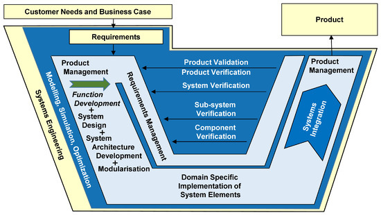 43]. The intention of this guideline is to assist design engineers and system architects during the essential activities pursued in the product development of cyber-physical systems. The guideline describes the logical relationships in the form of an inherent logic of the information flows mainly consisting of the system models. The central representation is an updated and extended form of the well-known V-model originating from software development [