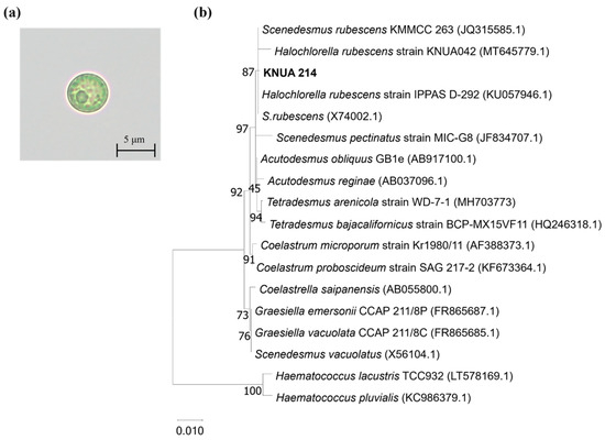 (a) Light microscope image of H. rubescens KNUA214. (b) Phylogenetic relationship of H. rubescens KNUA214 and its closely related species based on 18S rRNA sequence data. Numbers at nodes indicate percentage values derived from 500-bootstrap-analysis samples. The scale bar represents differences in nucleotide sequences.