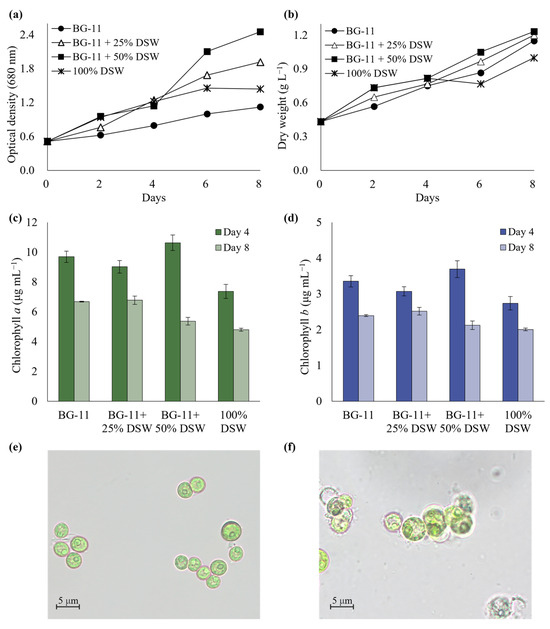 (a) Optical density, (b) dry weight, and (c) chlorophyll a and (d) chlorophyll b concentrations of H. rubescens KNUA214 under different concentrations of DSW for 8 days. Microscopy images of H. rubescens KNUA214 in (e) BG-11 and (f) 100% DSW over an 8-day period.