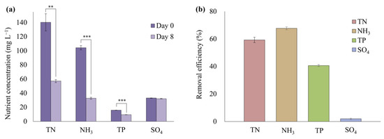 (a) Nutrient concentration and (b) percentage of removal efficiency in 100% DSW by H. rubescens KNUA214 over an 8-day period. Statistical significance between groups is denoted as follows: ** p < 0.01, *** p < 0.001.