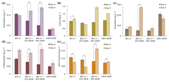 (a) Astaxanthin, (b) lutein, (c) zeaxanthin, (d) canthaxanthin, and (e) beta-carotene contents of H. rubescens KNUA214 cultivated under different concentrations of DSW on 4 and 8 days. Statistical significance between groups is denoted as follows: * p < 0.05, *** p < 0.001.