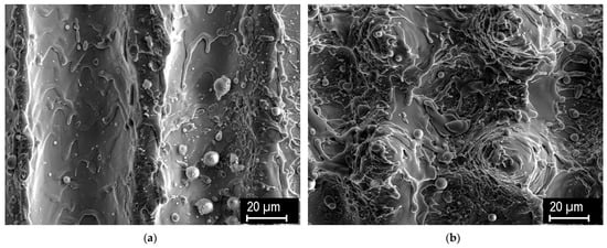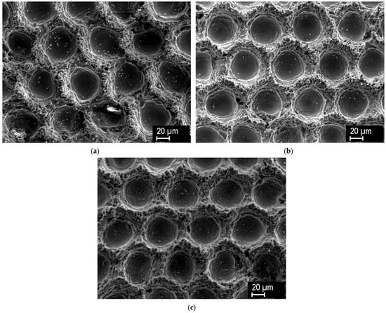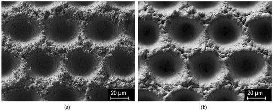 Figure 3b (treated with gentle ablation at the most intense setting) reveals that the major geometrical features of the texture are preserved, while only the micromorphology is affected. Specifically, the microroughness on the texture ridges is partially smoothed. In this figure, only the most diverse examples are shown, while for the other parameter combination, intermediate effects were observed.