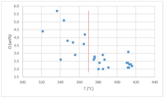 38], where changes in the process were observed in a similar temperature range, from 325 to 405 °C, for the calculated heat accumulation. In this case, an increase in the repetition frequency also led to a decrease in the heat accumulation temperature. The scatter of the oxygen values on the left side of