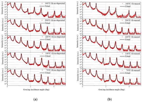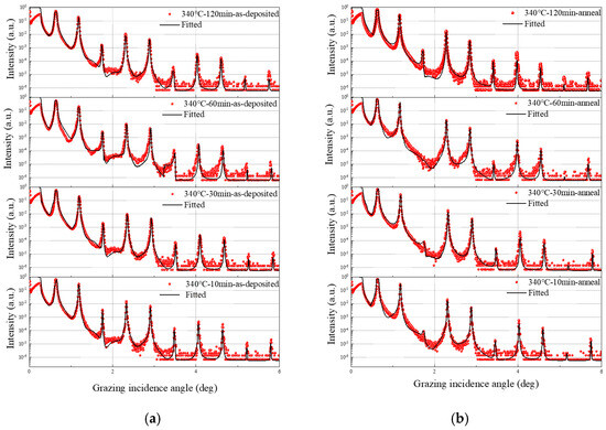 The GIXR curves and fitted curves: (a) before annealing, (b) after annealing.
