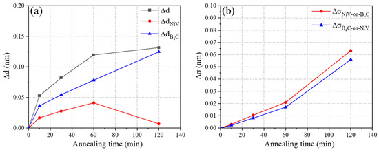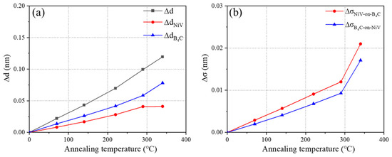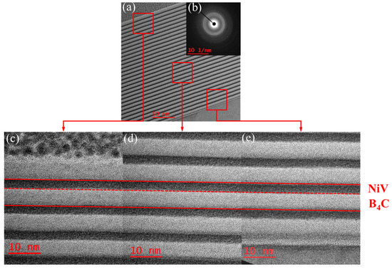 Multilayer optical elements have attracted widespread interest due to their special optical properties for application in fields such as plasma diagnostics and astronomical observation projects [1,2,3,4,5]. Nickel is considered one of the ideal materials for absorbing hard X-rays, as it lacks absorption lines in the 10 to 200 keV energy range. The Ni0.93V0.07 alloy overcomes the issue of nickel’s magnetism, which hinders its compatibility with magnetron sputtering. The NiV/B4C combination, characterized by higher reflectivity and smaller interface roughness, was recommended by the Danish Space Institute [6] for high-energy optical systems and was first implemented at the European Synchrotron Radiation Facility (ESRF) in 2017 [7]. Although the NiV/B4C combination has received extensive attention, the challenge of fabricating a high performance NiV/B4C multilayer has limited its development due to interface defects during deposition, which can affect the optical properties and stability of multilayers. To ensure the robustness of NiV/B4C multilayers, the multilayers were usually annealed to change their microstructures. Therefore, it is essential to comprehend the impact of annealing on the microstructure and properties of multilayers [8,9].