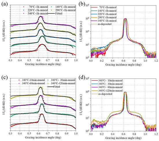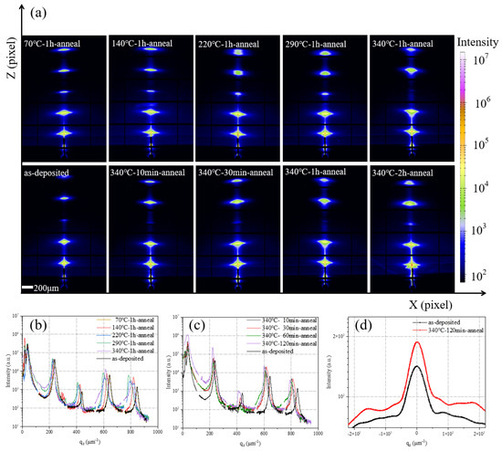 In Figure 8d, an enhancement of the scattering outside the Bragg sheets can be seen [25,26], which is more apparent in Figure 8a. In Figure 8d, the small peaks on both sides of the annealed sample correspond to the density fluctuation distribution. The line extraction of the sample before annealing has no visible peak outside the qx = 0 center, indicating that the sample does not have density fluctuations. Note that in the W/Si multilayer structure, similar density fluctuations are observed within the Si layer, which is attributed to the formation of crystals in the Si layer [26].