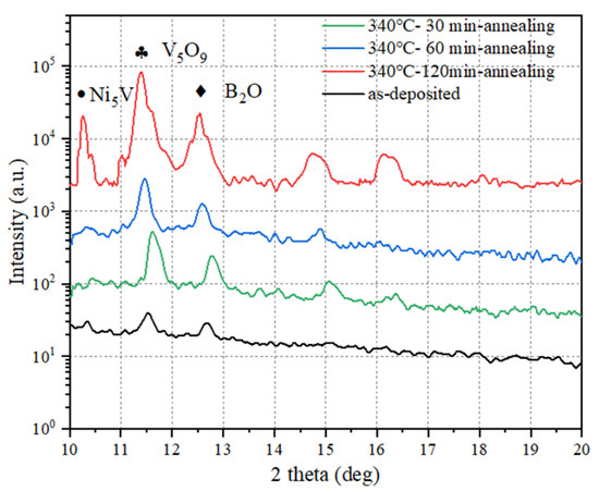 The crystallization was confirmed by XRD measurements, and the results are shown in Figure 6. In Figure 6, a (0 0 1) crystal plane diffraction peak of V5O9 appeared at 2θ = 11.453°, and no other sharp peaks were present when the annealing time was less than 120 min. This is consistent with previous research [22]. The crystal plane diffraction peaks of B2O (0 0 1) (PDF#41-0624) appeared at 2θ = 12.530° and a crystalline phase of Ni5V appeared at a smaller angle after annealing for 120 min [23]. With the increase in annealing temperatures, the (0 0 1) peak position of V5O9 moved to a lower 2θ, indicating that the crystallinity increased.