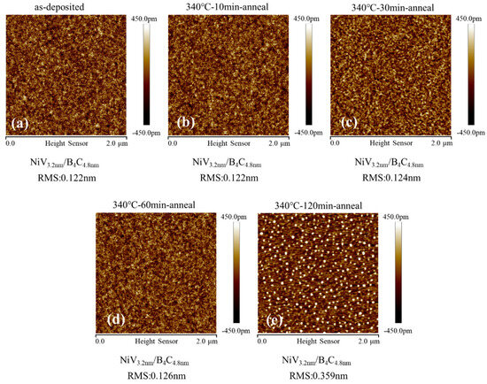 In Figure 7, comparisons of atomic force microscopy (AFM) measurements of the NiV/B4C multilayers are shown at 340 °C for different annealing times. To improve the accuracy of statistical information, the surfaces of all samples were measured several times at different spots. The average rms values of the NiV/B4C multilayers were rq ≈ 0.124 nm with annealing time less than 120 min. The rms value for the 120 min annealing sample was rq = 0.359 nm. Significantly, after 120 min of annealing, uniform bright spots appeared on the surface of the multilayer film, which were caused by the crystallization of the multilayer. This was consistent with the XRD results above.