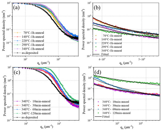 PSD functions of NiV/B4C multilayers: (a) annealing at different temperatures, (b) fitted curves, (c) annealing for different times, and (d) fitted curves.