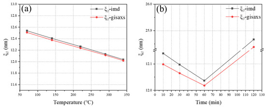 The lateral correlation length (the black line is the result of IMD software, and the red line is the result of GISAXS): (a) annealing at different temperatures, (b) annealing for different times.