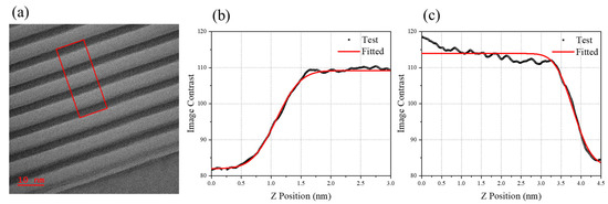 TEM gray scale image and fitting results: (a) grayscale information selection, (b) layer profiles and (c) fitting curve obtained from the images in the plane of the layer.