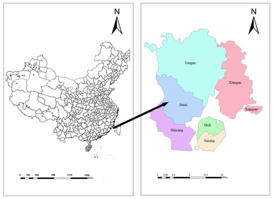 The study area is Xiamen City. Xiamen City is a famous tourist city in China, located in the middle of the west coast of the Taiwan Strait and the center of the Golden Triangle in southern Fujian. Xiamen municipality is composed of the mainland area along Xiamen Bay in southeastern Fujian Province and the islands of Xiamen Island and Gulangyu Island as well as Xiamen Bay. The land area of Xiamen is 1699.39 km2, of which Xiamen Main Island has a land area of about 158 km2 (including Gulangyu Island) and a sea area of about 390 km2. Xiamen has six municipal districts, including Huli, Siming, Tongan, Jimei, Haicang, and Xiang’an districts.