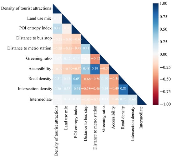 The bandwidth of the MGWR model was calculated using the AICc method through the ArcGIS 10.8. The minimum, upper quartile, median, lower quartile, and maximum values of each influencing factor are shown in Table 4. The results were tested using SPSS software 28.0 to estimate the p-value of the regression coefficient. The p-value can test the significance of each influencing factor. The results show that the p-value of the selected factors in the paper have very significant characteristics and are suitable for use as explanatory variables. If ranked according to the absolute value of the mean of the regression coefficients, the results are as follows: accessibility > intersection density > density of tourist attractions > land use mix > POI entropy index > road density > intermediate > distance to metro station > distance to bus stop. The R2 of the MGWR model (0.78) is higher than that of the GWR (0.61) and OLS (0.42).