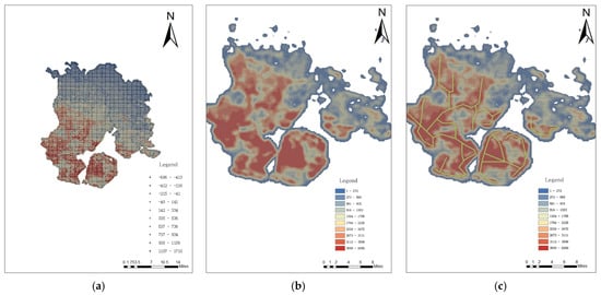 Greenway planning of Xiamen based on grid suitability. (a) Suitability distribution map. (b) Kernel density map of areas with suitability greater than 0. (c) Formation of a greenway based on the centerline of areas with high values.