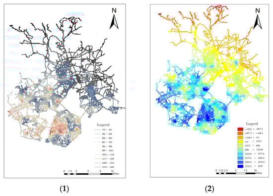 Table 4 shows the calculation results of MGWR for each factors. Table 5 shows the spatial pattern of the coefficients of each influencing indicator in the MGWR model. The relationship between the number of shared bicycle trips and the indicators can be seen from these two tables. The negative value indicates a total negative correlation. The accessibility coefficient has a range of [−159.7316, −39.8026], a mean value of −17.3211, and a standard deviation of 38.8871, which indicates that for every 1 m increase in accessibility, the number of shared bicycle trajectory points decreases by 17. The intersection density, the density of tourist attractions, the distance to metro station, and intermediate all have a negative effect on the density of shared bicycle OD points. The POI entropy index, road density, distance to bus stop, greening ratio and the land use mix all positively contribute to the density of shared bicycle OD points.
