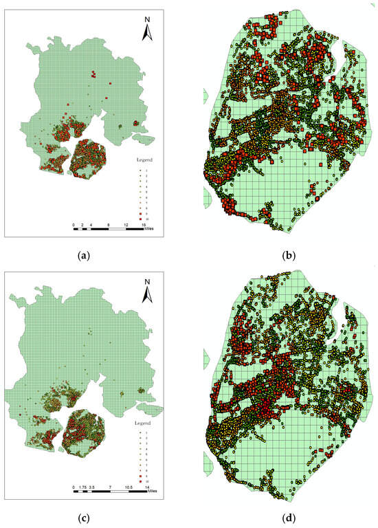 The Moran’s I statistic ranges between −1 and +1. Larger positive values indicate that spatial aggregation as an attribute value tends to be similar for close observations and different for distant observations. Negative values indicate spatial discreteness, and values close to zero indicate spatial randomness. For this study, p < 0.05 was required, and variables with p ≥ 0.05 had to be removed [].