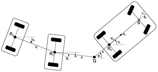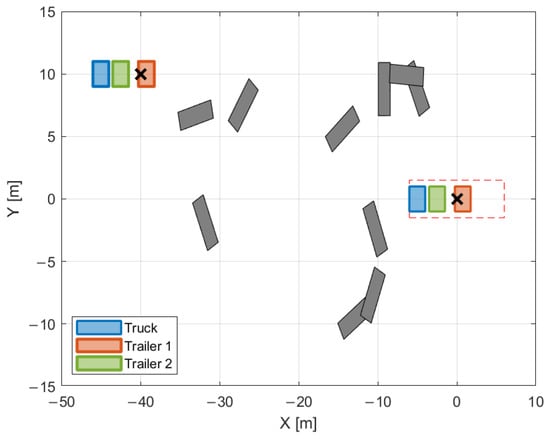 The endpoints are referred to as for the first trailer and for the second trailer. Due to the mutual connection of all the vehicles in the truck–trailer system, it is possible to omit the constraints on the endpoints of the first trailer. This reduces the number of constraints and speeds up the computation.