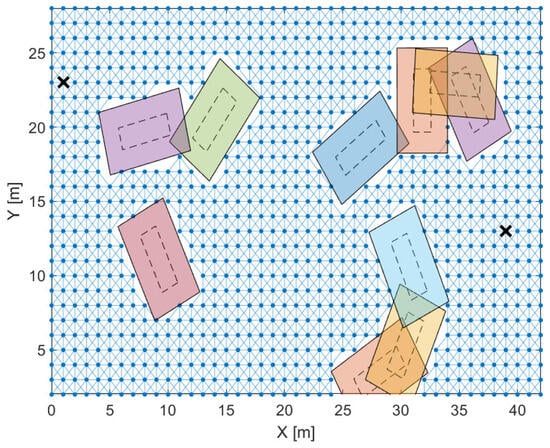 Prior to carrying out the path search, it is necessary to expand the obstacles and define the individual nodes. The parameter is chosen as , indicating one node per meter. A graphical representation of the considered problem is shown in Figure 3, where the black cross on the left represents an initial position of and the black cross on the right represents the target position. Note that the target area is no longer a rectangular shape, but instead a reference point at the appropriate location in accordance with Figure 1. Note that due to simplicity of processing of the weighted graph, the entire grid is shifted in both directions compared to Figure 1.