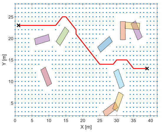 Another possibility is to make the path planning problem into an NLP (nonlinear programming) problem. By finding the minimum of a suitably specified problem, a path between two points can be found []. The disadvantage of this approach is the need to use a global solver for the optimization problem; otherwise, it is very likely to find only a local minimum. Thus, in the case of path planning, we may find a link between two points, but not necessarily the shortest one. Another problem is the time-consuming nature of such procedures, which is why this approach has not been used recently.
