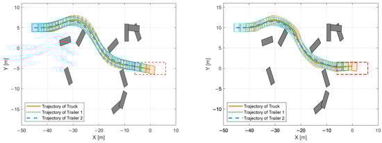 The outputs of previous Phase 3 are feasible trajectories for the simplified model of the truck according to Equation (18). The goal of Phase 4 is to find trajectories with respect to the dimensions of the truck and the presence of obstacles. The results of the previous Phase 3 are used here as an initial estimate. The most significant change is that the path points are no longer considered in the cost function. Similar to Phase 3, the dynamics here relate to the model of the truck provided by Equation (18). Regarding the constraints, all angles defining the entire truck–trailer system’s position are newly introduced.
