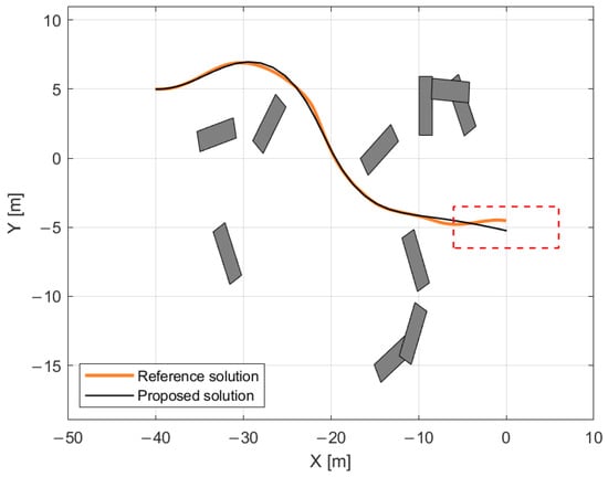 Several relevant indicators were selected for comparison of the proposed and reference solutions, as summarized in Table 2, which provides a numerical comparison between the proposed solution and reference solution across several performance metrics, including computational time, cost function value, total driving time, trajectory point count, distance traveled, and cumulative sum angle differences of the front wheels. The table highlights differences in efficiency and effectiveness, with a note indicating that the reference solution’s computational time includes the use of an initial estimate.