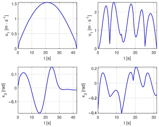 Such a simplification is sufficient for the first design of the trajectories, which can serve as a basis for further optimization runs when we have a more complex model of the system. The described truck model has only four states. In this case, for the purpose of incorporating time optimization it is necessary to add a fifth state , representing the total time needed to realize the desired trajectory. We first select an appropriate constant velocity profile for use in Phase 2. This selection adheres to widely accepted kinematic assumptions. Linear velocities below 1–2 m/s (approximately 3.6–7.2 km/h) are generally considered suitable for ensuring minimal dynamic forces such as centripetal acceleration. For urban-like scenarios or controlled environments (e.g., robotics or autonomous systems), a maximum linear velocity of 0.5–1.5 m/s is often applied. In tighter spaces such as parking or obstacle avoidance, the lower end of this range (0.5–1 m/s) is preferred. Based on these considerations, we set . The total time is determined through an optimization process representing the time required to travel from the initial to the target position. The total travel distance depends on the path determined in Phase 1 while respecting the vehicle’s dynamics. Using the constant velocity profile, the travel distance can be expressed as .