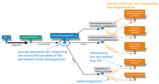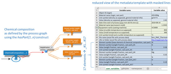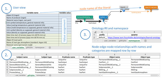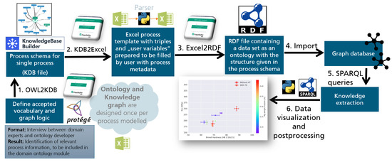 - Creation of impartible process graph templates: at this point, a single process step is generically represented as a knowledge graph (from now on denoted as ‘Process Graph’). For this purpose, the software InfoRapid KnowledgeBase Builder [38] is used, which offers a graphical user interface for generating graphs. The Process Graph template generation of an impartible process consists of modifying a generic Process Graph template based on the information gathered from the interview template filled in the previous step and consequent established domain-specific vocabulary (domain ontology). This step is accomplished with the help of the functionality OWL2KDB of the ‘Graph Designer Tool’ [36], which allows the user to import concepts from an existing ontology into the graphing tool. Creating a process-specific Process Graph template is an iterative process. It might take a few hours to days to semantically represent all relevant parts of the modeled process, depending on its level of description detail and complexity. The generated graph for describing the relevant metadata of the digitalized process is then converted into an Excel template. This substep is performed with the help of another functionality of the Graph Designer Tool, referred to as KDB2Excel;