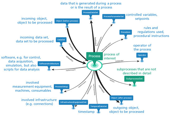 - isInputFor and hasOutput are relations to describe the chronological order along the process chain and are attached to nodes, which are either the input for a process (Object and DataSet) or the output thereof (Object and ProcessDataSet). During process design, the categories of the ingoing and outgoing objects can be further specified/refined. The same holds for the ingoing DataSet. The node ProcessDataSet collects all data, that is either generated during the course of a process (e.g., raw data) or is the result thereof (e.g., analyzed material properties);