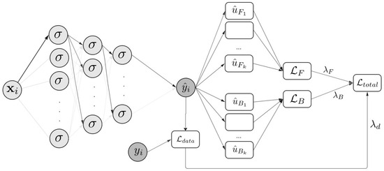 where refers to the NN approximation with parameters [18]. In this scenario, the neural network must learn to approximate the differential equations by identifying the parameters that define the neural network. This is done by minimizing a loss function that includes the differential equation , the boundary conditions , and possibly some known data :