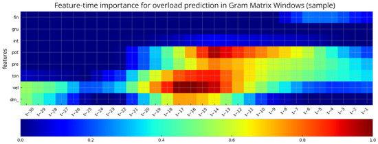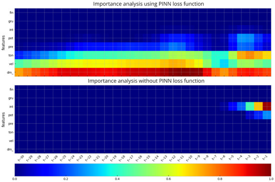 To analyze the influence of specific features on the model’s predictive performance, we employed GradCam++ [47], an interpretive technique tailored for deep learning frameworks, particularly convolutional neural networks. GradCam++ builds upon Grad-CAM [48] by leveraging gradients from a designated target layer, typically the final convolutional layer, concerning the class of interest. This approach provides detailed insights into the contributions of individual neurons to the decision-making process. This analysis was confined to CNN’s GRAM transformation segment in our architecture. As shown in Figure 8, our analysis identified nine distinct patterns (clusters) used by the convolutional network to detect overloads. These clusters highlight how feature relationships and the network’s focus on specific periods evolve to predict overloads. For instance, the first cluster emphasizes throughput, speed, and time since last maintenance in the final five minutes, whereas the fifth cluster focuses on coarse, intermediate, power, and pressure metrics in the first five minutes of the 15-min window. This adaptability demonstrates the network’s ability to respond to temporal dynamics in operational data, independent of the physical rules layer. Figure 8 illustrates how the physical loss function influences the network’s decisions. By integrating physical rules, the network shifts its focus, making throughput, velocity, pressure, power, and maintenance time more relevant across different moments, unlike previously observed isolated emphasis. An intriguing question arises: Why do physical rules emphasizing speed, power, and pressure lead the network to focus on granulometry? That could reflect the network’s resilience in uncovering additional relationships beyond the physical rules. To deepen the analysis, we examined the first cluster (Figure 9). Initially, the model focuses on granulometry during the last five minutes to predict overloads. However, after incorporating physical rules, the focus broadens across all intervals, primarily focusing on throughput, mill speed, and elapsed time since the last maintenance. This shift underscores the enhanced interpretability and adaptability introduced by integrating physical rules into the model.